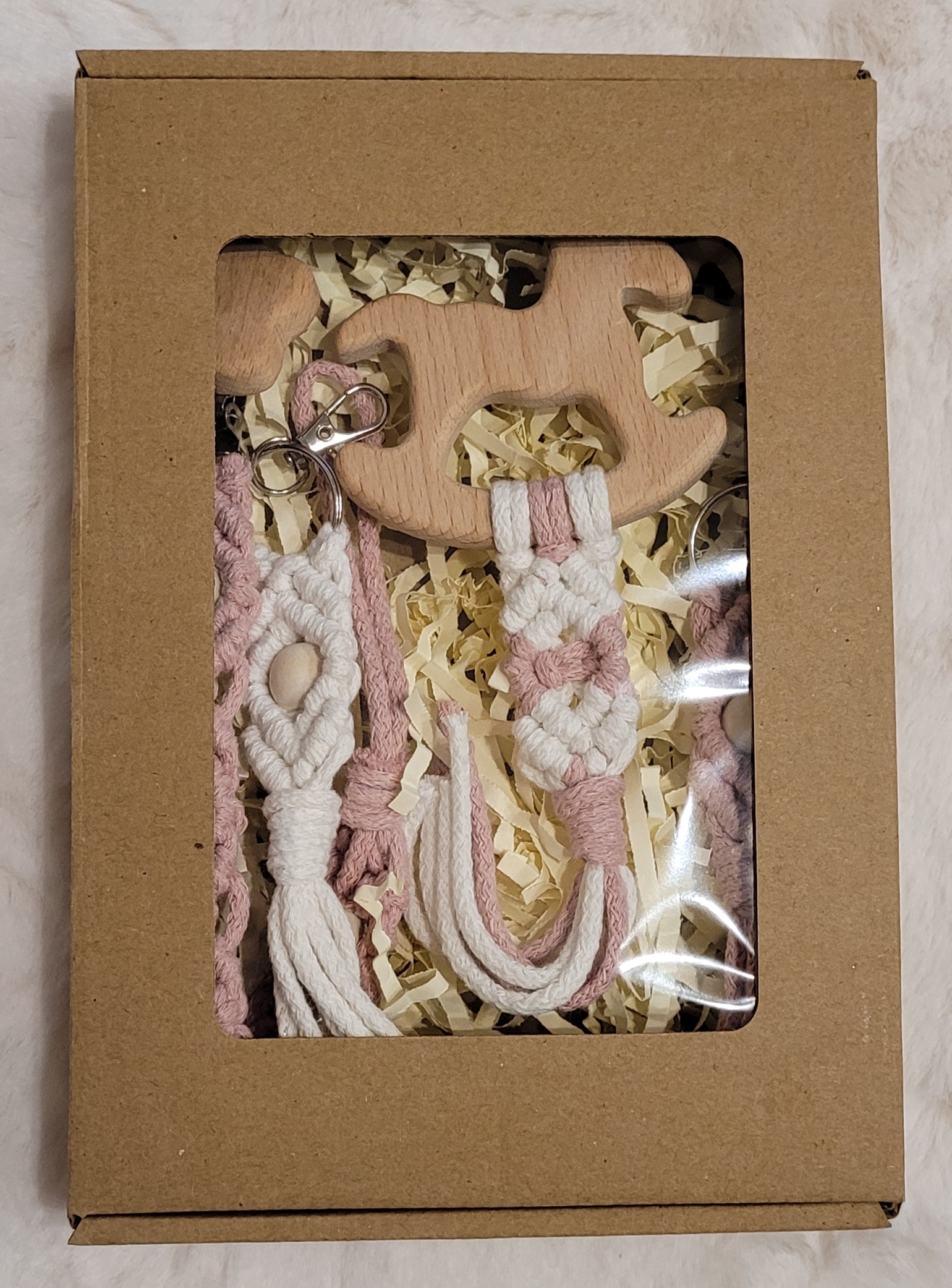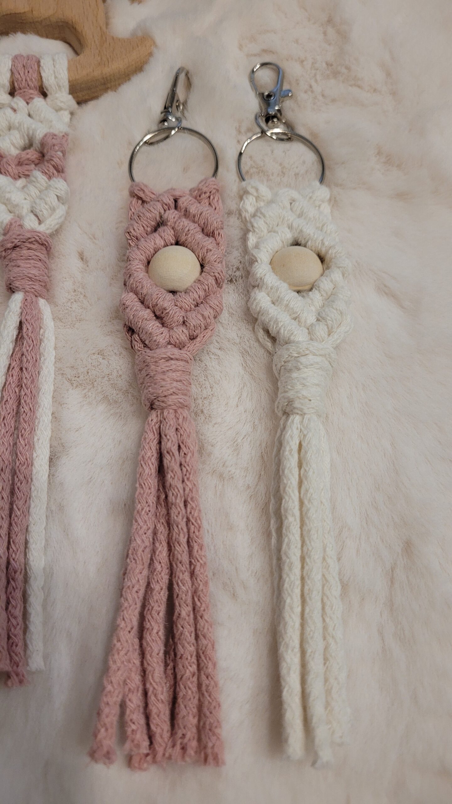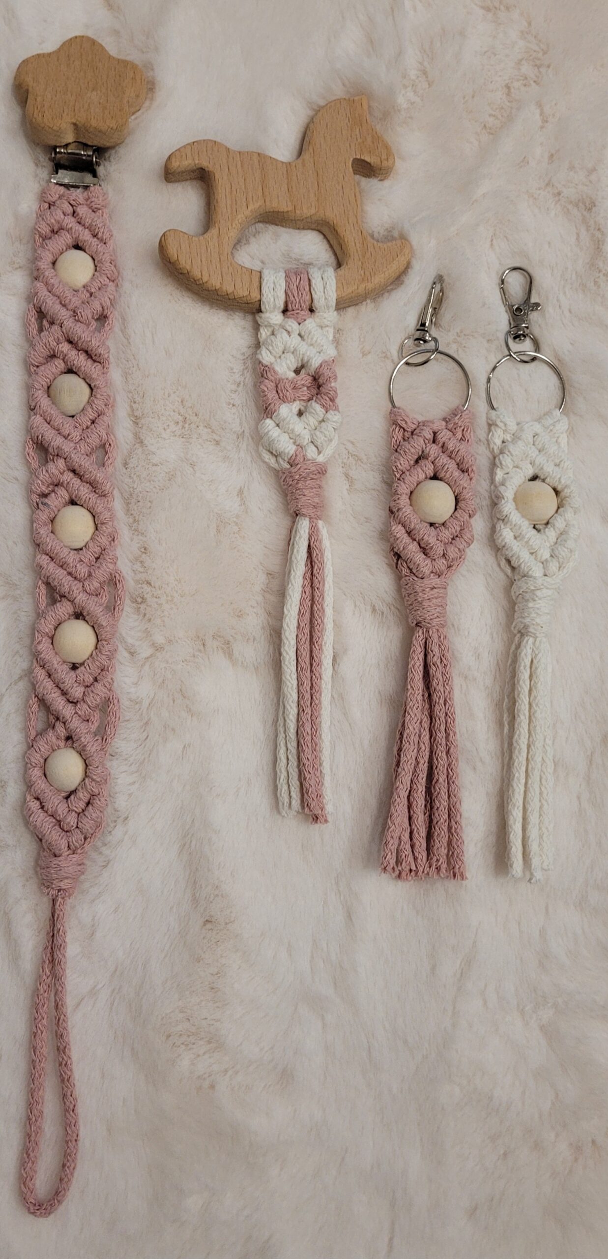 - breloczków ( 2 szt) z myślą o rodzicach malucha zaplatanych metodą makrama, koralika drewnianego, bazy metalowej, którą z łatwością można zapinać jak i odpinać.
